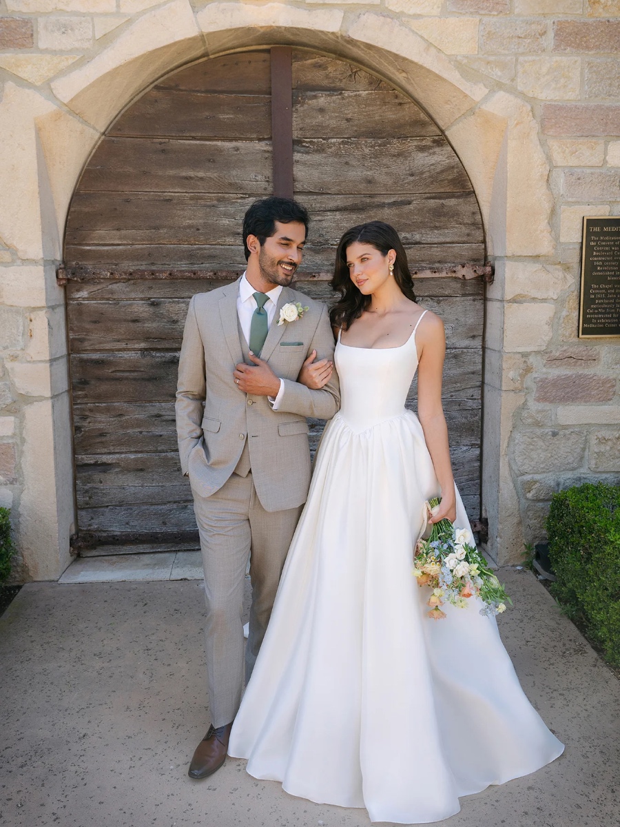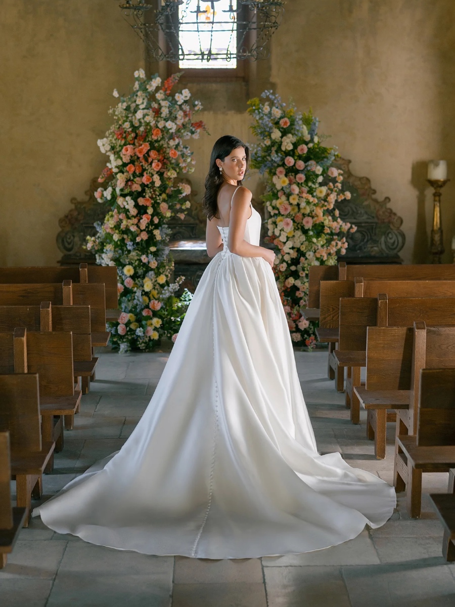 Effortlessly polished, this Mikado ballgown features a ballet neckline and delicate spaghetti straps for a refined yet modern silhouette. The structured bodice and basque waist sculpt the figure before flowing into a voluminous skirt that moves with graceful presence. Minimalist in detail yet rich in design, this gown embodies understated luxury for the bride who values clean lines and timeless craftsmanship.