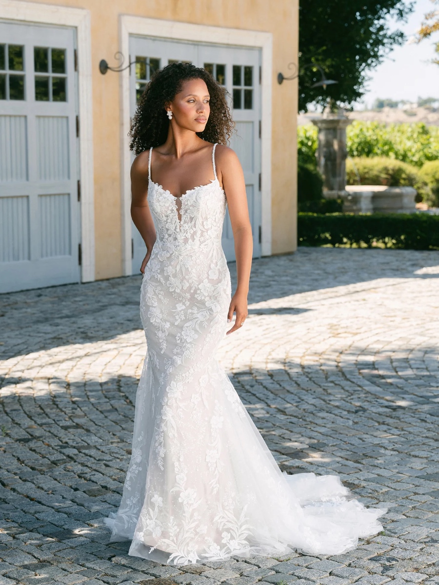 This shimmering sheath gown combines modern allure with delicate detailing. Beaded and sequin lace appliques trail over layers of sequin and sparkle tulle, catching the light with every movement. The V-neck bodice and slender spaghetti straps create a graceful, feminine shape, while the low back and natural waist enhance the gown’s sleek, sculpted silhouette. Elegant and luminous, this design captures the perfect balance of texture, shimmer, and sophistication.