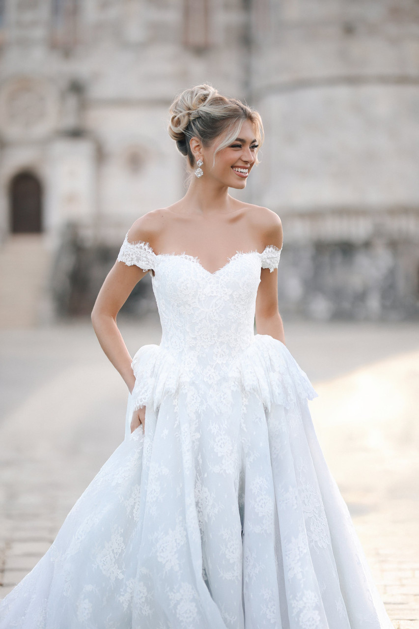 Inspired by Cinderella’s night of transformation, this off-the-shoulder lace ballgown captures the romance and wonder of her story. The peplum waist and voluminous skirt create a graceful silhouette, while intricate lace sparkles softly under the light — a design that celebrates the magic of new beginnings and the belief that dreams can come true.
