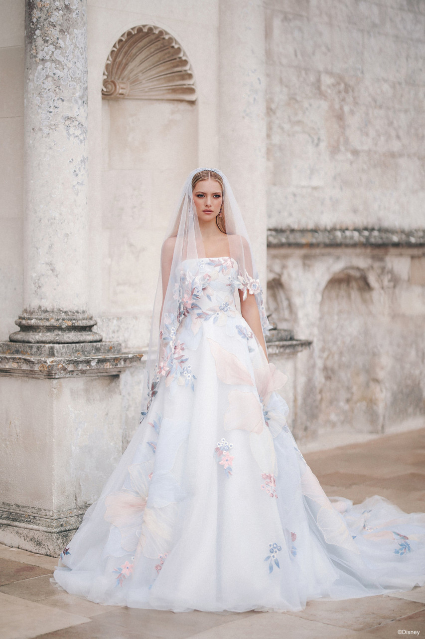 Alive with color and imagination, this Rapunzel-inspired ballgown celebrates her adventurous spirit and the world she longed to explore. Layers of soft blue tulle create a dreamy foundation for oversized floral appliqués that bloom boldly across the gown in vivid shades of blue, pink, and soft gold. Some petals are sculpted from pleated tulle, adding dimension and movement reminiscent of lanterns drifting through the night sky. With its sleek straight neckline and luminous detailing, this gown captures Rapunzel’s artistry, courage, and the radiant joy of stepping into the light of her own story.