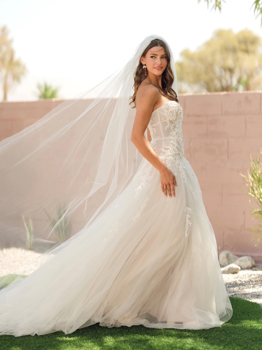 This gown blends romance and shimmer in a stunning glitter tulle A-line silhouette. The strapless corset bodice is adorned with scrolling sequin lace that adds a subtle sparkle throughout, featuring a sculpted sweetheart neckline for an elegant effect. Bold seaming defines the natural waistline while a low drop waistline accentuates the figure before the glittering tulle skirt flows gracefully. The back offers a glamourous low-back effect, finished by a row of fabric-covered buttons while the frothy train completes this luxurious bridal gown.